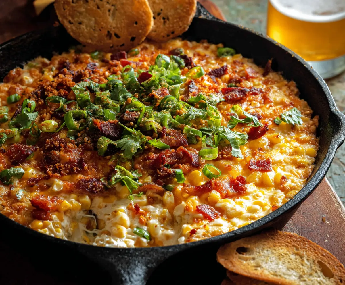 This warm and cheesy corn dip is packed with crispy bacon and gooey cheese, making it perfect for sharing at parties or cozy nights in. Just dig in with your favorite chips!