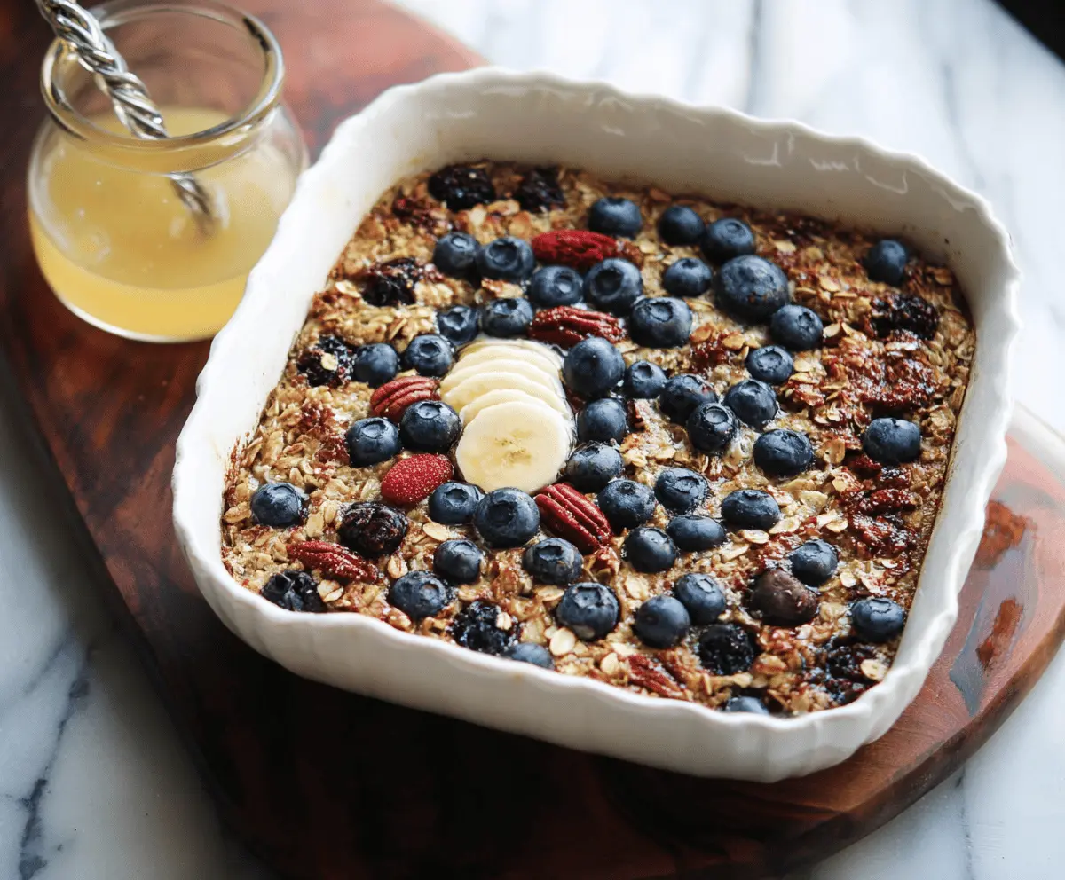 Delicious baked breakfast oatmeal with fresh berries and a golden crust, perfect for a healthy morning meal.