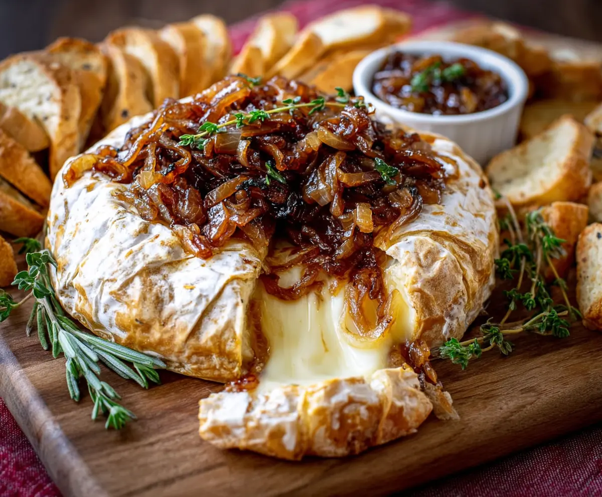 Once baked, carefully remove the Brie from the oven. Garnish with extra thyme leaves, if desired, for that fresh touch. Serve hot with your toasted baguette slices for dipping and spreading over the melted Brie and caramelized onions.