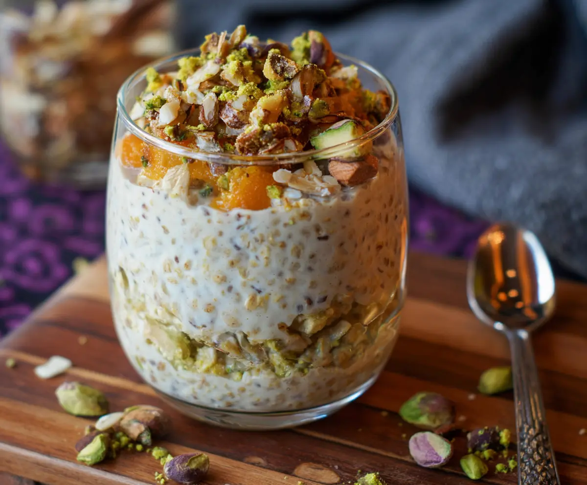 Layer the overnight oats into a glass or bowl, and top with the remaining chopped nuts and dried fruit. Add an extra touch by garnishing with a sprinkle of crushed pistachios, walnuts, and a drizzle of honey. If you have rose petals, they make a pretty garnish too!