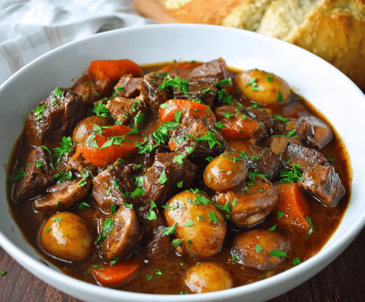 This hearty beef stew is packed with tender chunks of beef and earthy mushrooms. It simmers slowly to bring out all the rich flavors and make the meat fall-apart good!
