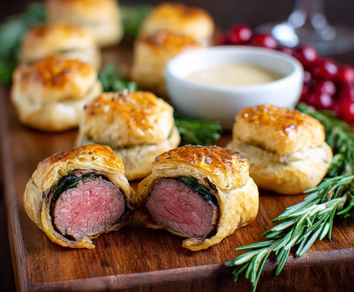 Garnish the Beef Wellington Bites with fresh rosemary sprigs and cranberries if you like. Serve them warm alongside your chosen dipping sauce, like creamy horseradish or mustard.