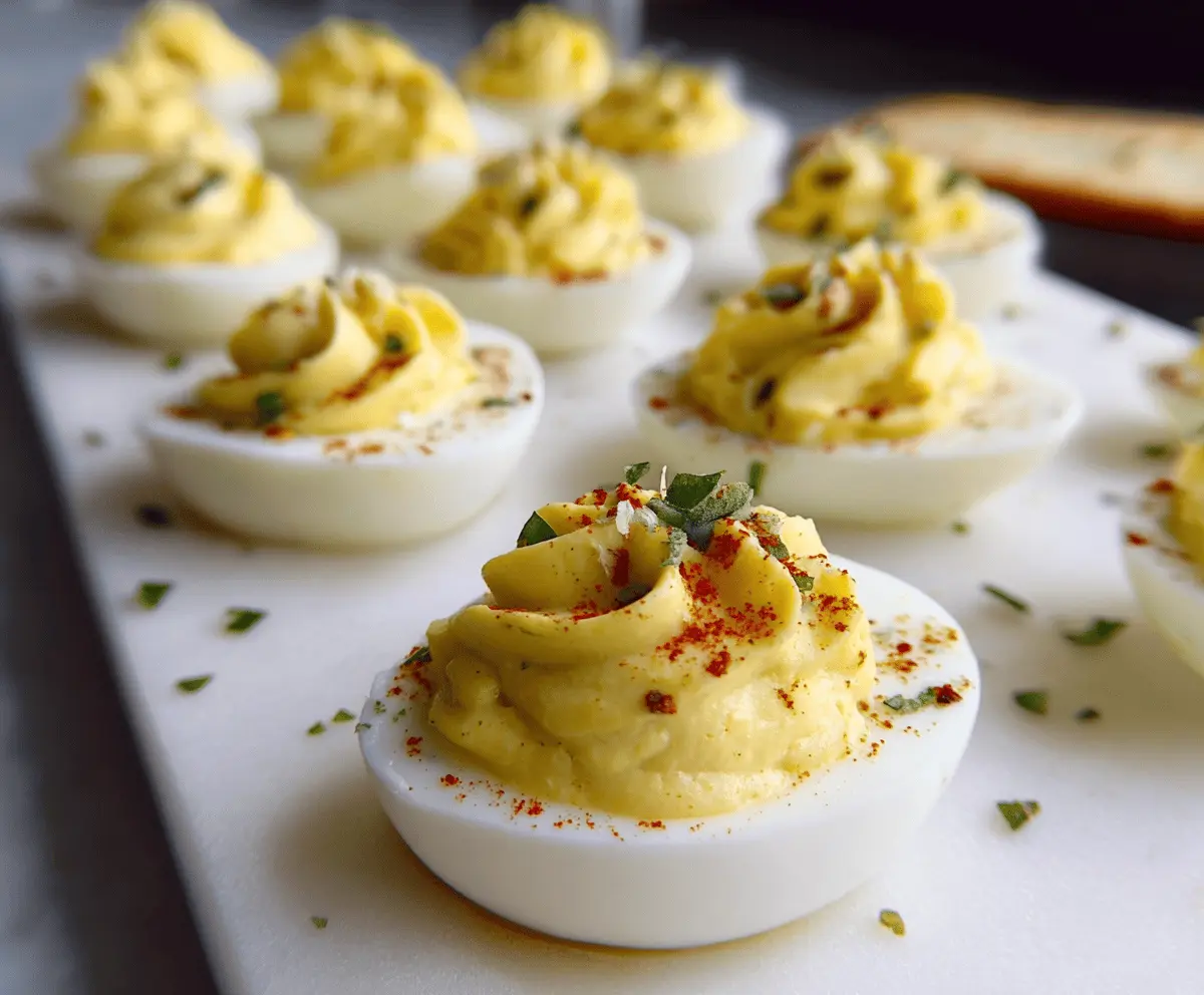 For a decorative touch, use a piping bag fitted with a star tip to fill the egg whites. You can also add extra garnishes like edible flowers, olives, or sliced radishes for additional color and appeal!