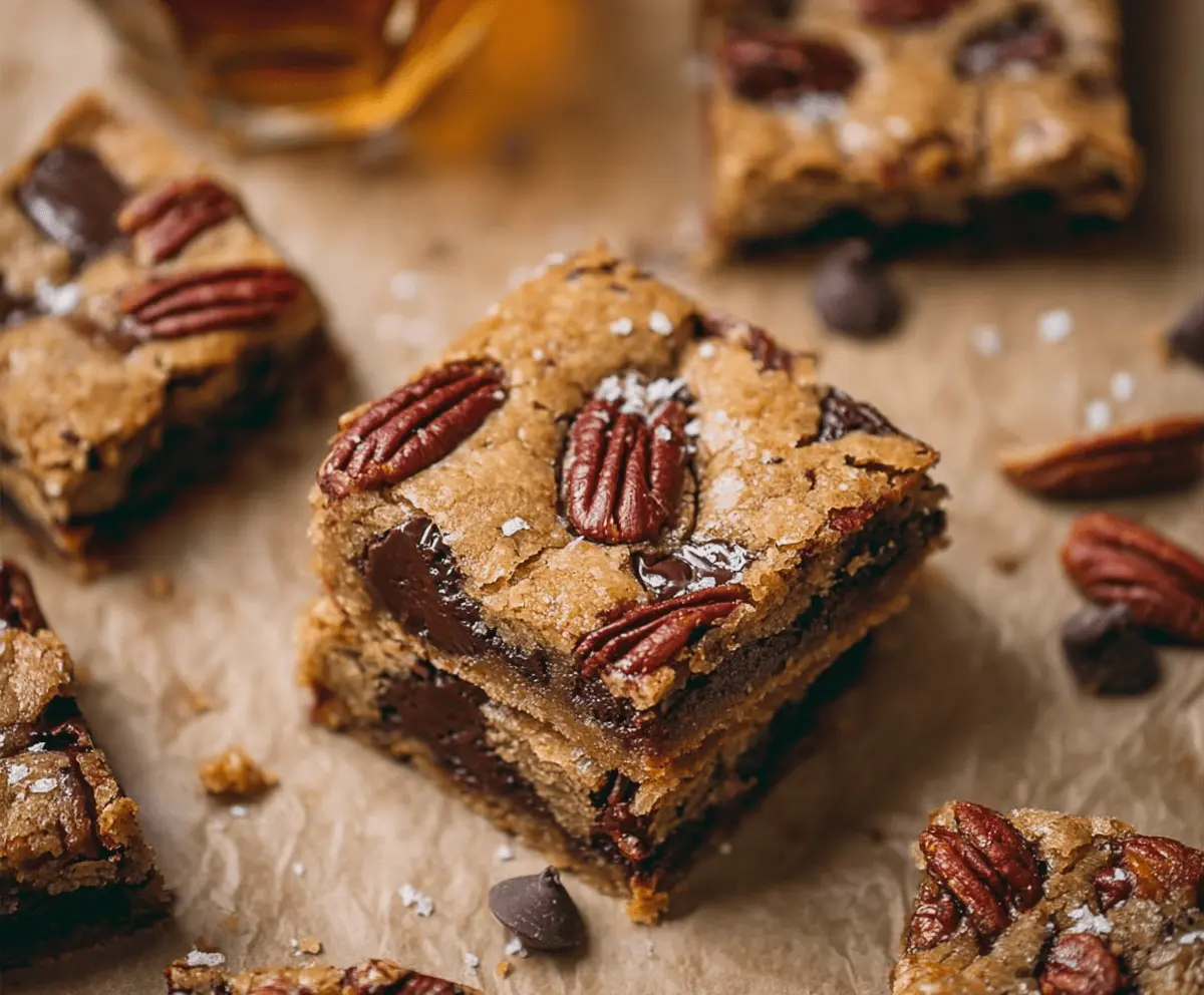 Transfer the batter to your prepared baking pan and spread it evenly. Top with some whole pecan halves for a decorative touch and press them lightly into the batter. Bake in the oven for 25-30 minutes. You’ll know they’re done when the edges are set and a toothpick inserted in the center comes out with moist crumbs.