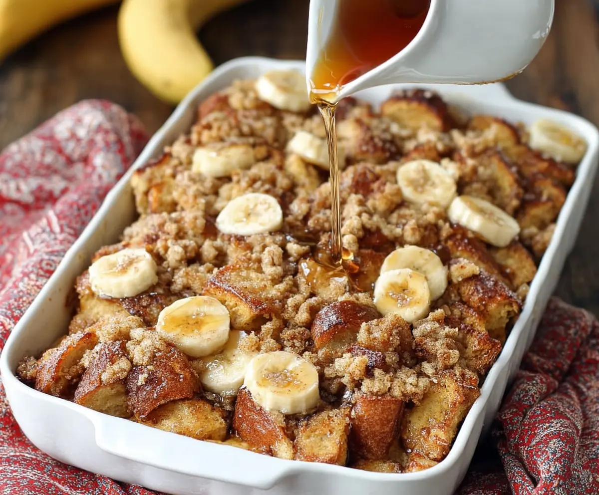 This casserole has a moist custardy interior with delightful banana flavor, topped off with a crunchy brown sugar crumble—perfect for a delightful breakfast or brunch with family and friends!