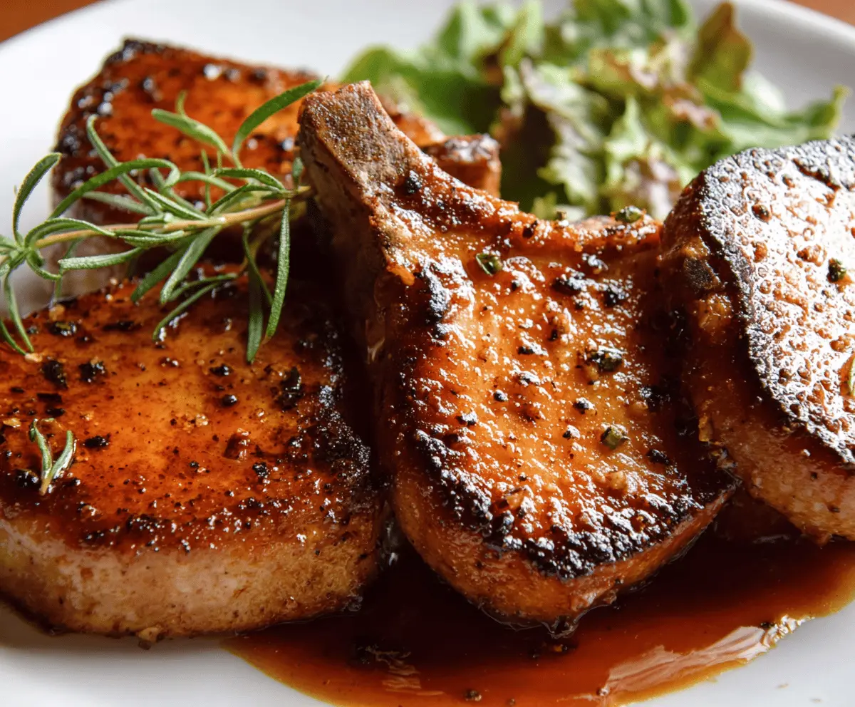 Juicy brown sugar glazed pork chops garnished with fresh herbs on a rustic wooden table, perfect for a flavorful dinner