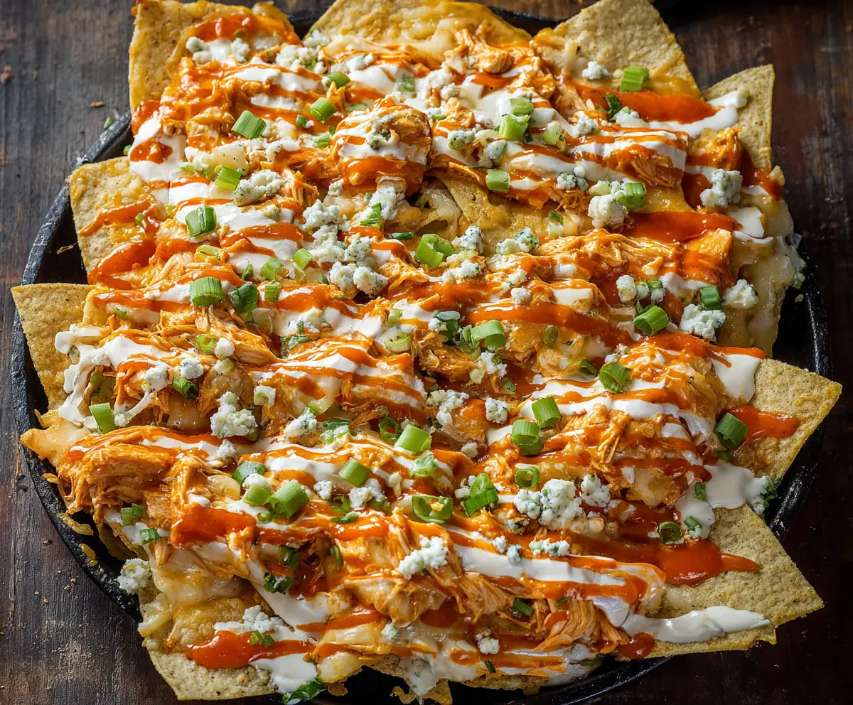 Buffalo Chicken Nachos are a fun twist on a classic snack! Picture crispy tortilla chips piled high with spicy buffalo chicken, melted cheese, and tasty toppings like sour cream and green onions.