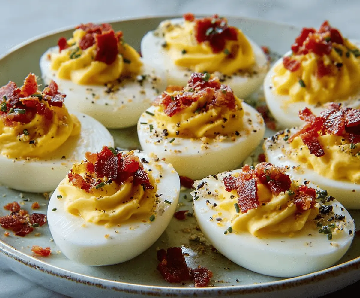 Sprinkle the remaining crispy bacon over the filled eggs to add a crunchy topping. Finish with a dash of freshly ground black pepper and some chopped fresh parsley or chives for that pop of color.