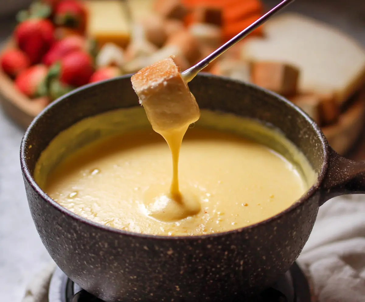 Cheese fondue is a warm, gooey treat that’s perfect for sharing. Just melt a mix of tasty cheeses and dip in bread, veggies, or anything else your heart desires!