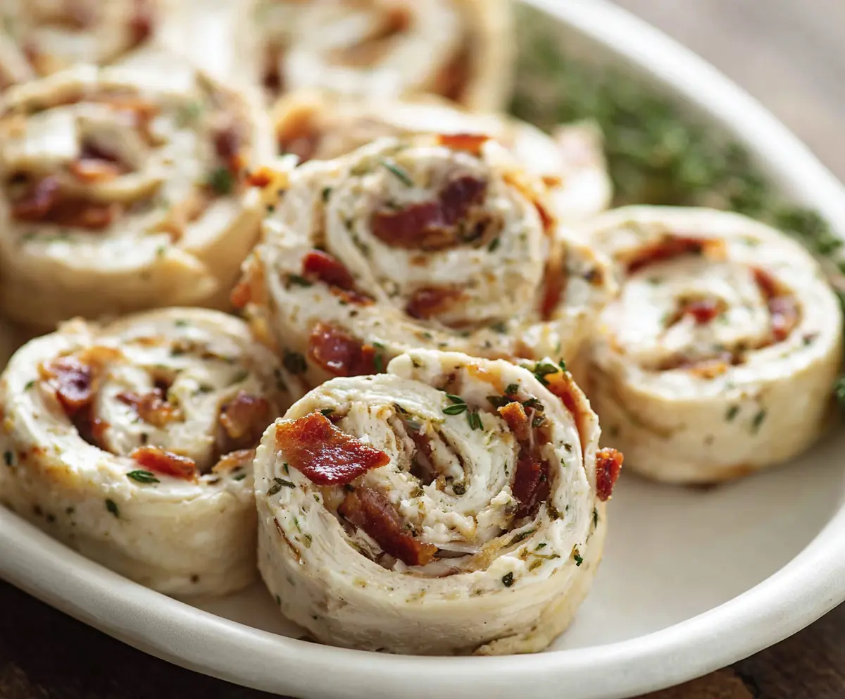 Delicious Chicken Bacon Ranch Pinwheels sliced for serving on a plate.