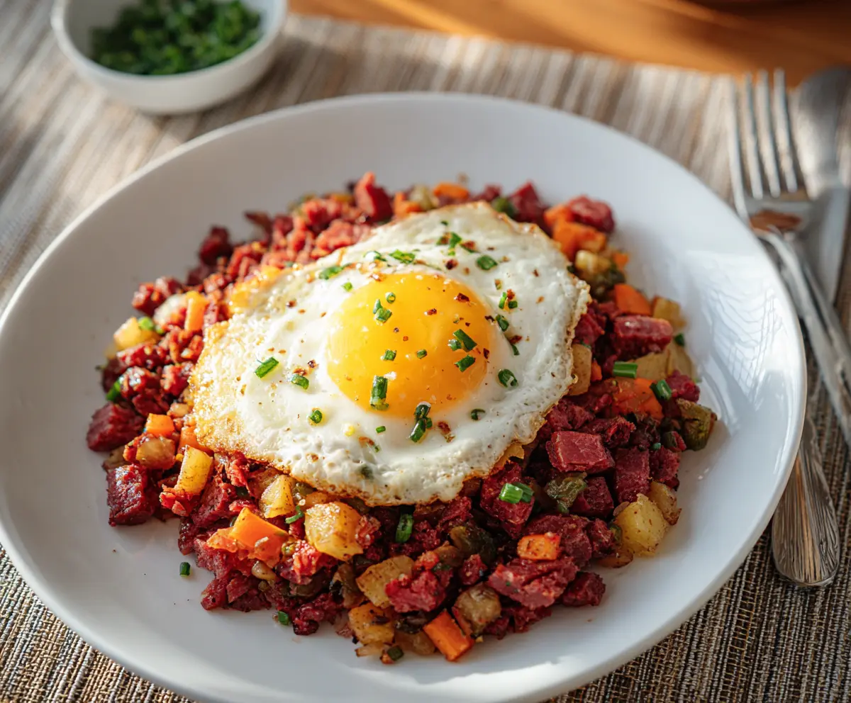 Enjoy your hearty corned beef hash with fried egg while it’s hot! This dish brings together the savory flavors perfectly, making it a delicious way to start your day.