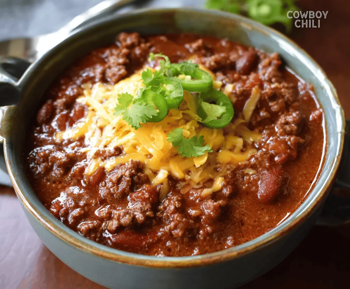 Serve your Cowboy Chili hot in bowls. Top with shredded cheddar cheese, a dollop of sour cream, fresh cilantro leaves, and slices of jalapeño for that extra kick. Pair it with warm cornbread or tortilla chips—and enjoy a hearty, comforting meal!