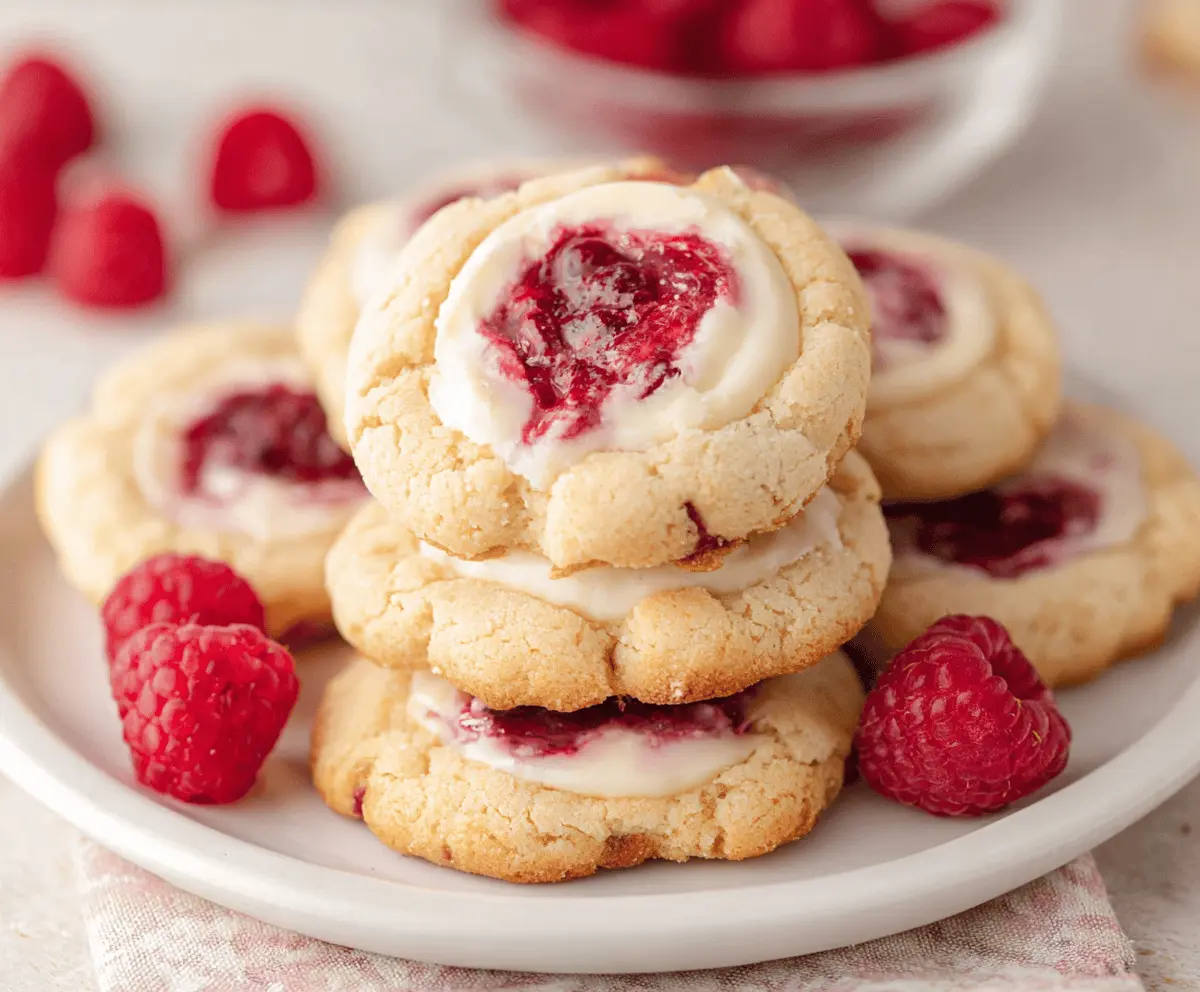 If you like, garnish with fresh raspberries before serving. These cookies are scrumptiously soft with a rich cream cheese base and a sweet, fruity raspberry center. Perfect with a cup of tea or coffee!