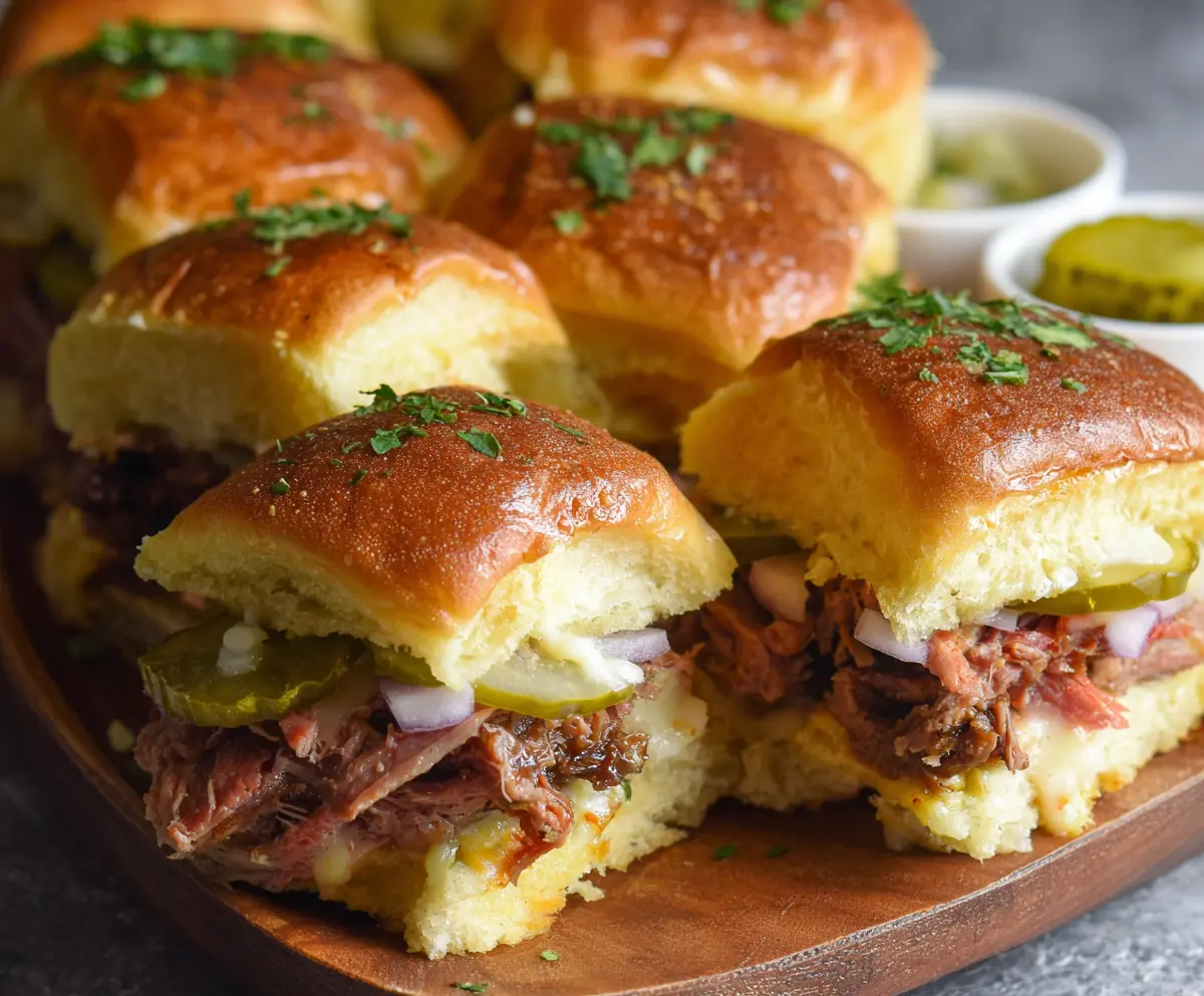Cuban Sliders are little sandwiches packed with delicious flavors! They usually have juicy pork, melted cheese, pickles, and mustard all tucked inside soft bread.