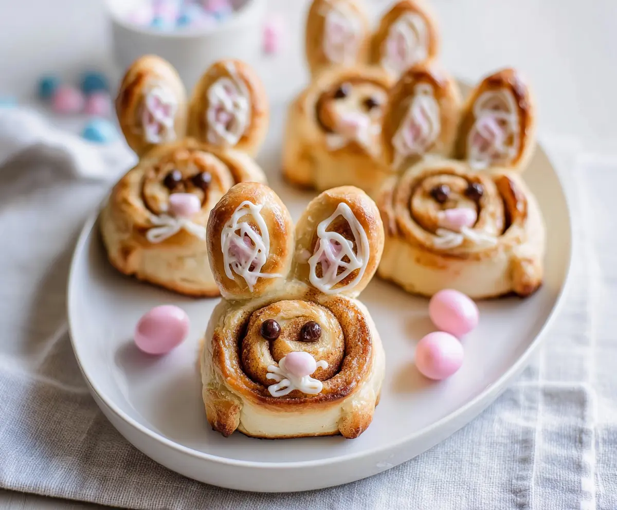These Easter Bunny Cinnamon Rolls are a fun and tasty treat! They are fluffy rolls filled with sweet cinnamon and sugar, shaped like adorable bunnies to celebrate the holiday.