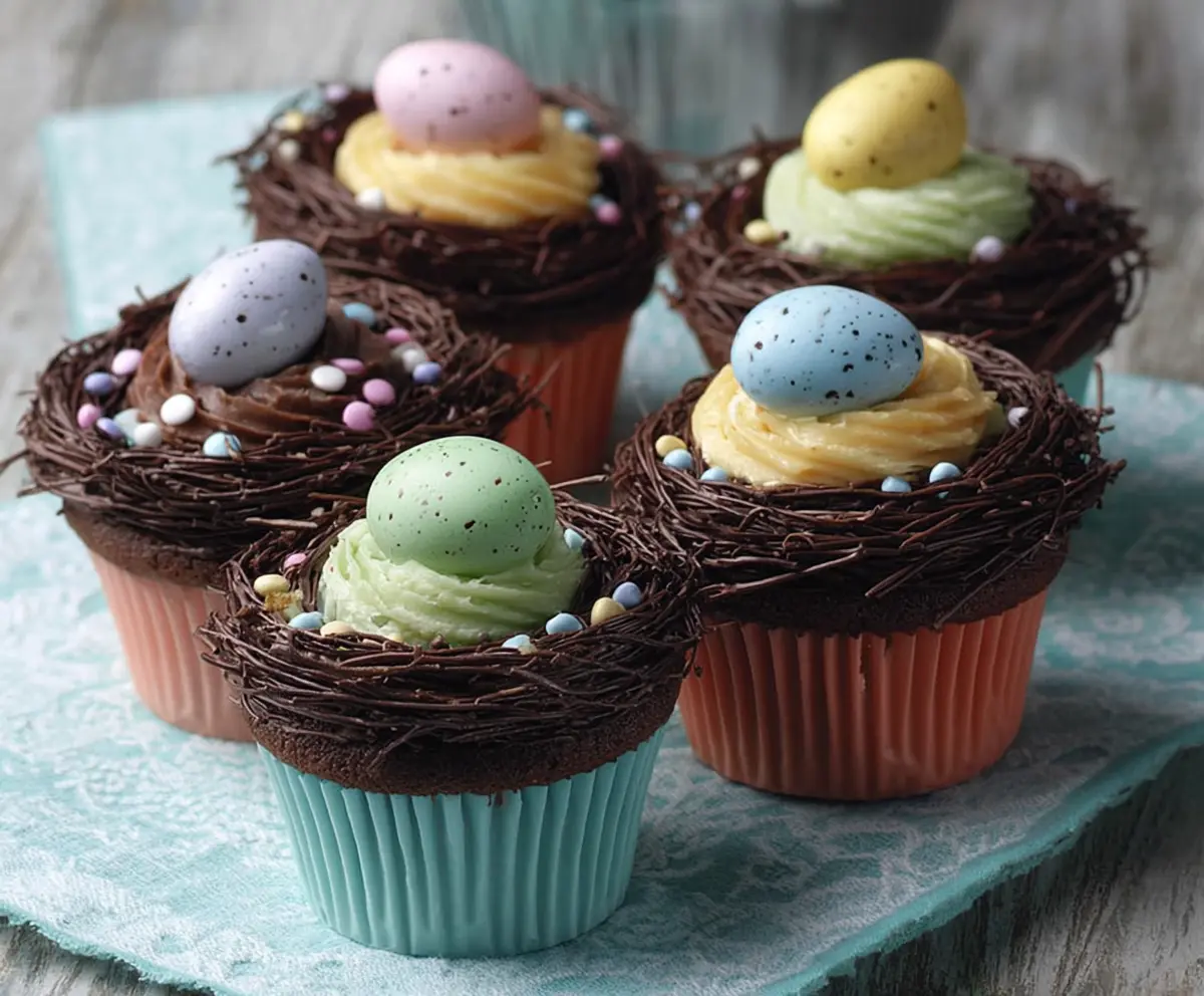 These delightful cupcakes combine delicious chocolate cupcakes with colorful pastel frosting and cute chocolate nests topped with candy eggs, making them a perfect treat to brighten up any spring celebration. Enjoy!