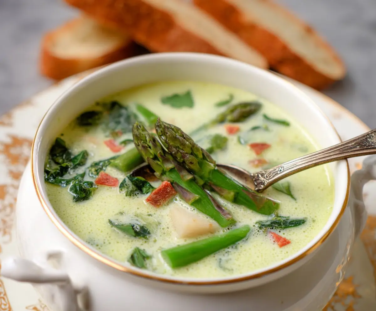 Ladle the warm, creamy soup into bowls. Top each serving with the sautéed asparagus tips and a handful of the homemade croutons. For an extra treat, serve it with some crusty bread on the side. Enjoy every spoonful of your fresh French Spring Soup!