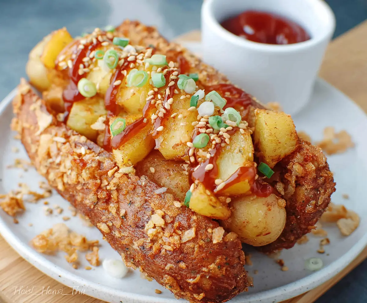 Delicious Korean Potato Hot Dog with crispy coating and melted cheese on a plate.