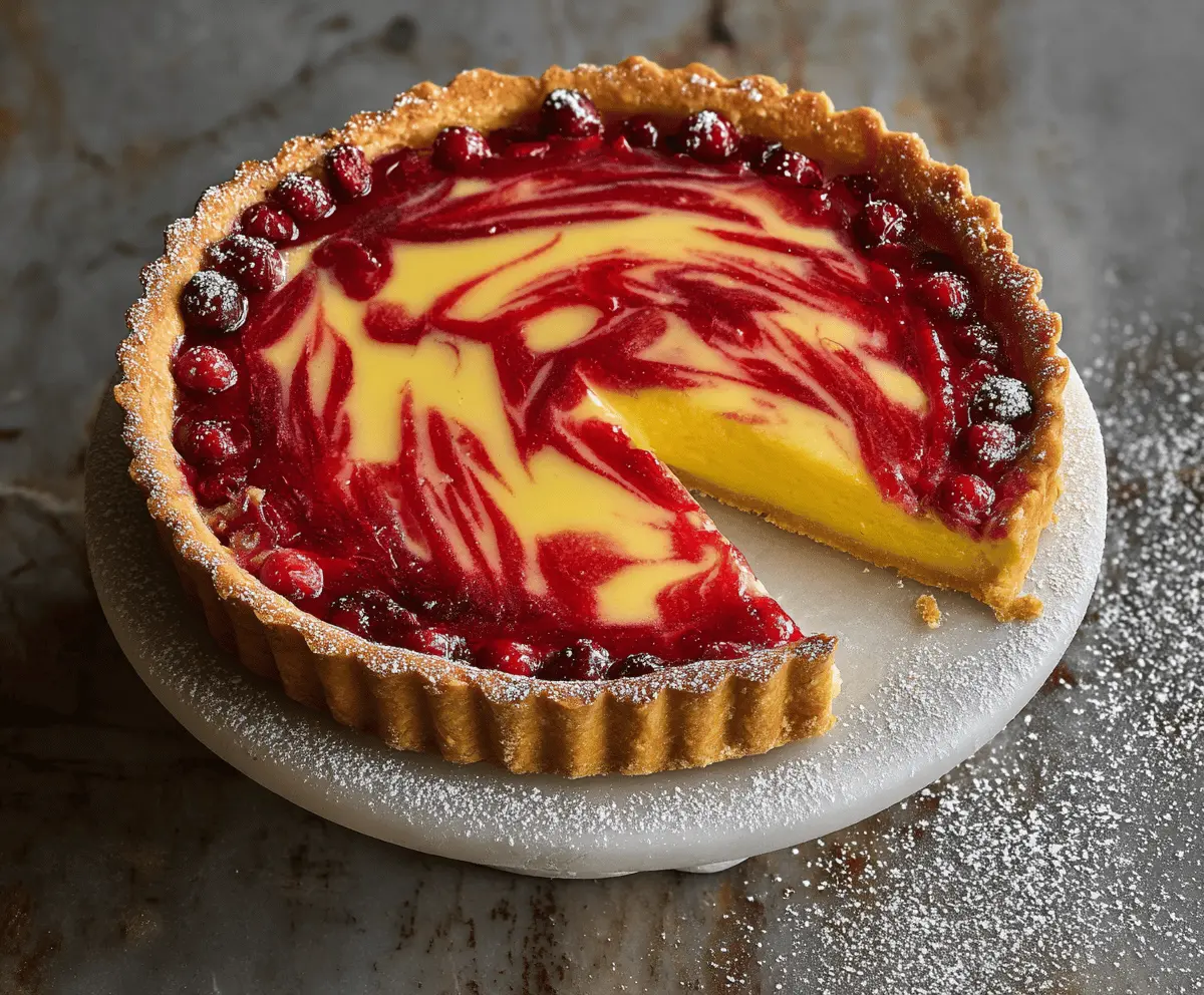 Pour half of the lemon curd into the cooled tart shell and spread it evenly. Spoon dollops of the cranberry sauce over this layer, then drizzle the remaining lemon curd on top, spreading gently.