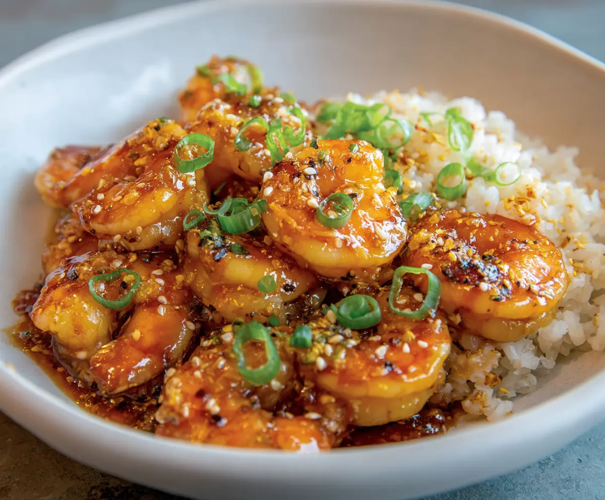 Juicy orange honey garlic shrimp served on a plate, garnished with fresh herbs.