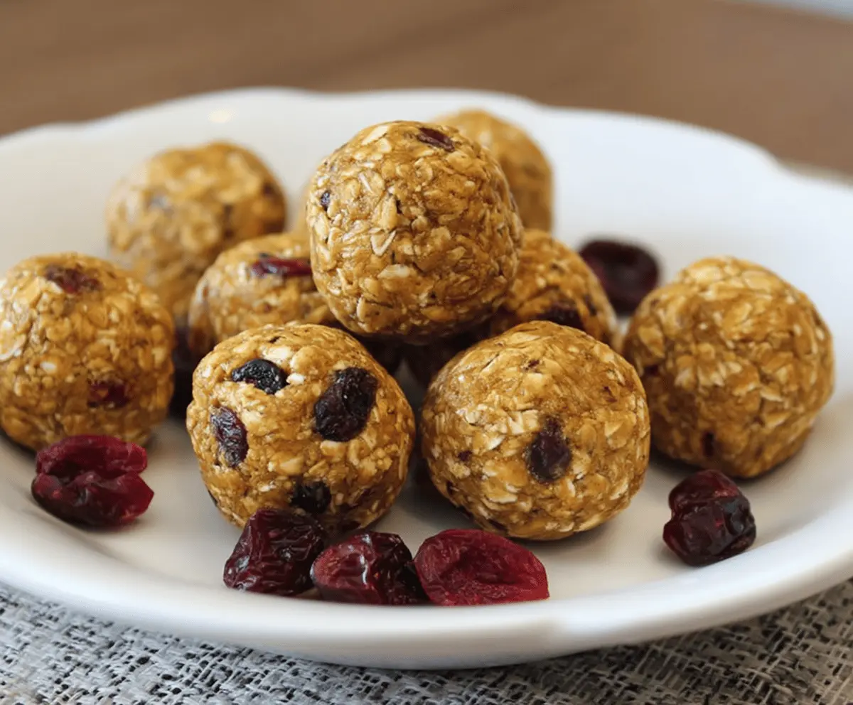 Healthy Pumpkin Cranberry Energy Bites with oats, dried cranberries, and pumpkin seeds in a white bowl, perfect for a nutritious snack