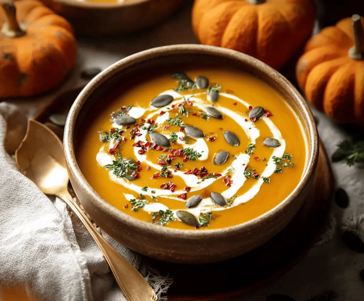 Creamy pumpkin soup garnished with fresh herbs in a rustic bowl, perfect for cozy autumn meals.