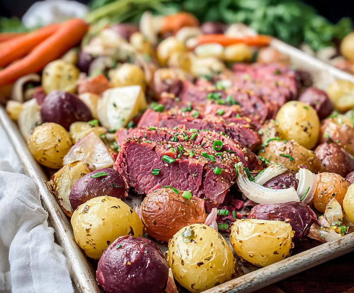 This Sheet Pan Corned Beef is a quick and tasty dish! You get juicy corned beef cooked with colorful veggies like potatoes, carrots, and cabbage, all on one pan.