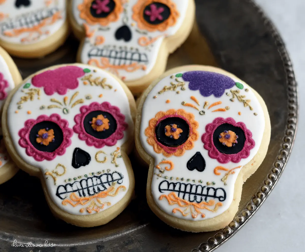 Once the cookies are fully dry, store them in an airtight container at room temperature. These colorful skull sugar cookies are perfect for celebrations like Día de los Muertos, Halloween, or any festive occasion. Enjoy your delicious and artistic treats!