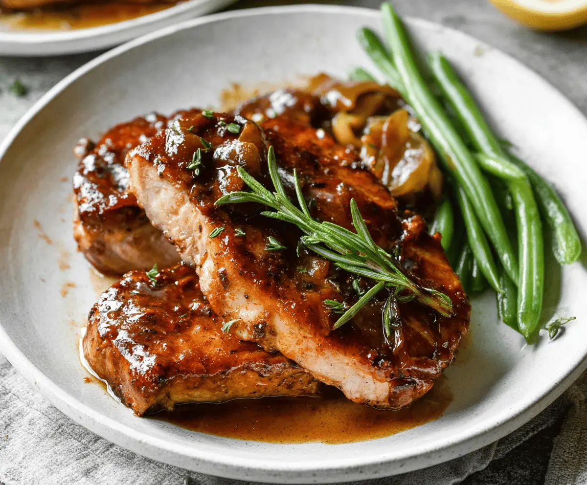 Pour the thickened sauce over the pork chops. If you’d like, garnish with fresh thyme sprigs. Serve warm alongside the potatoes and green beans for a comforting meal.