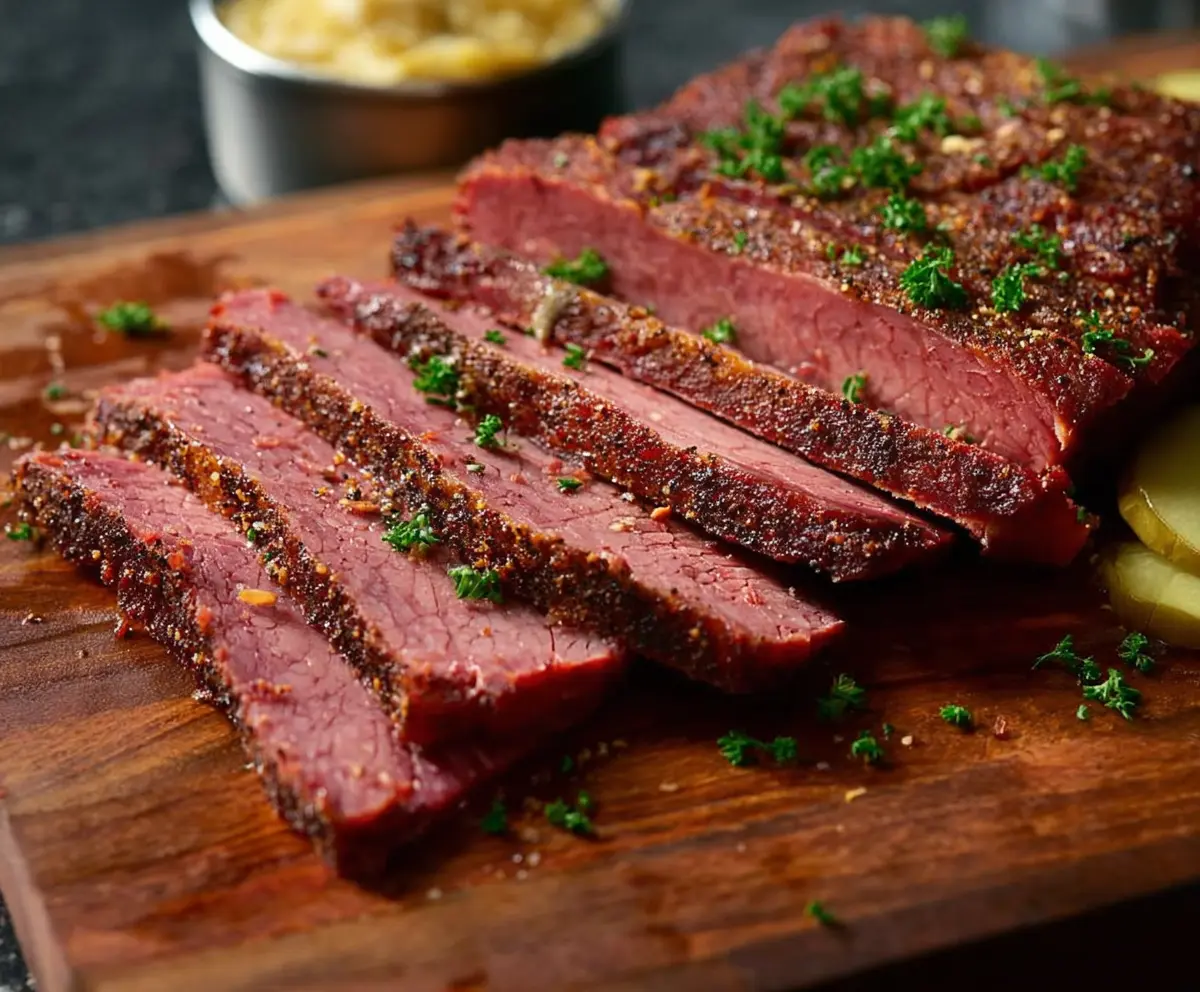 Garnish your beautiful smoked corned beef with chopped fresh parsley. Serve it up with sliced pickles on the side and, if you like, some mustard or horseradish sauce. Enjoy the amazing flavors you’ve created!