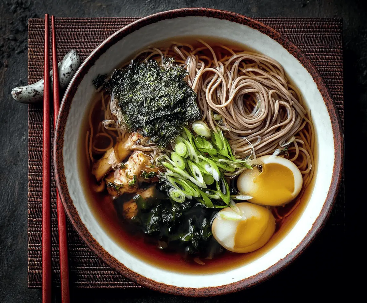 Soba noodle soup is a warm, comforting bowl filled with tasty Japanese noodles and a flavorful broth. It usually comes with fresh veggies and can be topped with a soft-boiled egg or some tofu.