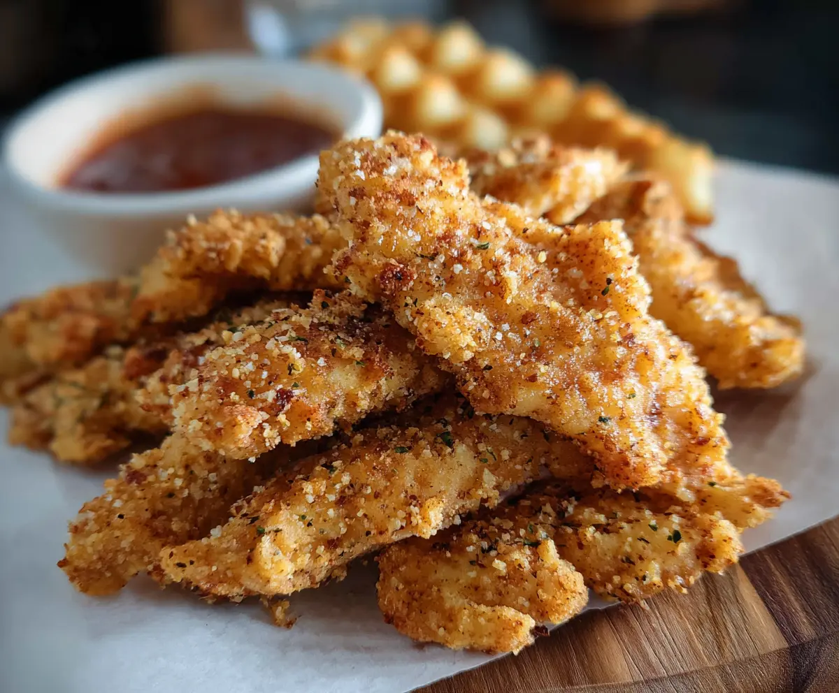 Once cooked, garnish the chicken strips with freshly chopped parsley for a pop of color. Serve them warm with your favorite dipping sauce such as ketchup, BBQ sauce, or honey mustard. Enjoy your crunchy, flavorful chicken strips!