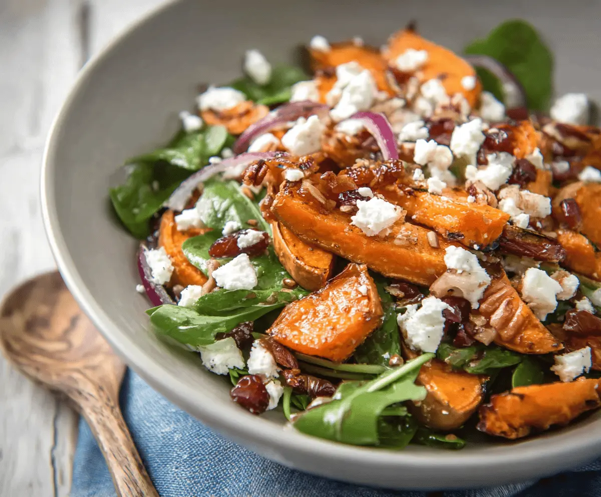 Fresh sweet potato and feta salad garnished with herbs, perfect for a healthy, colorful meal