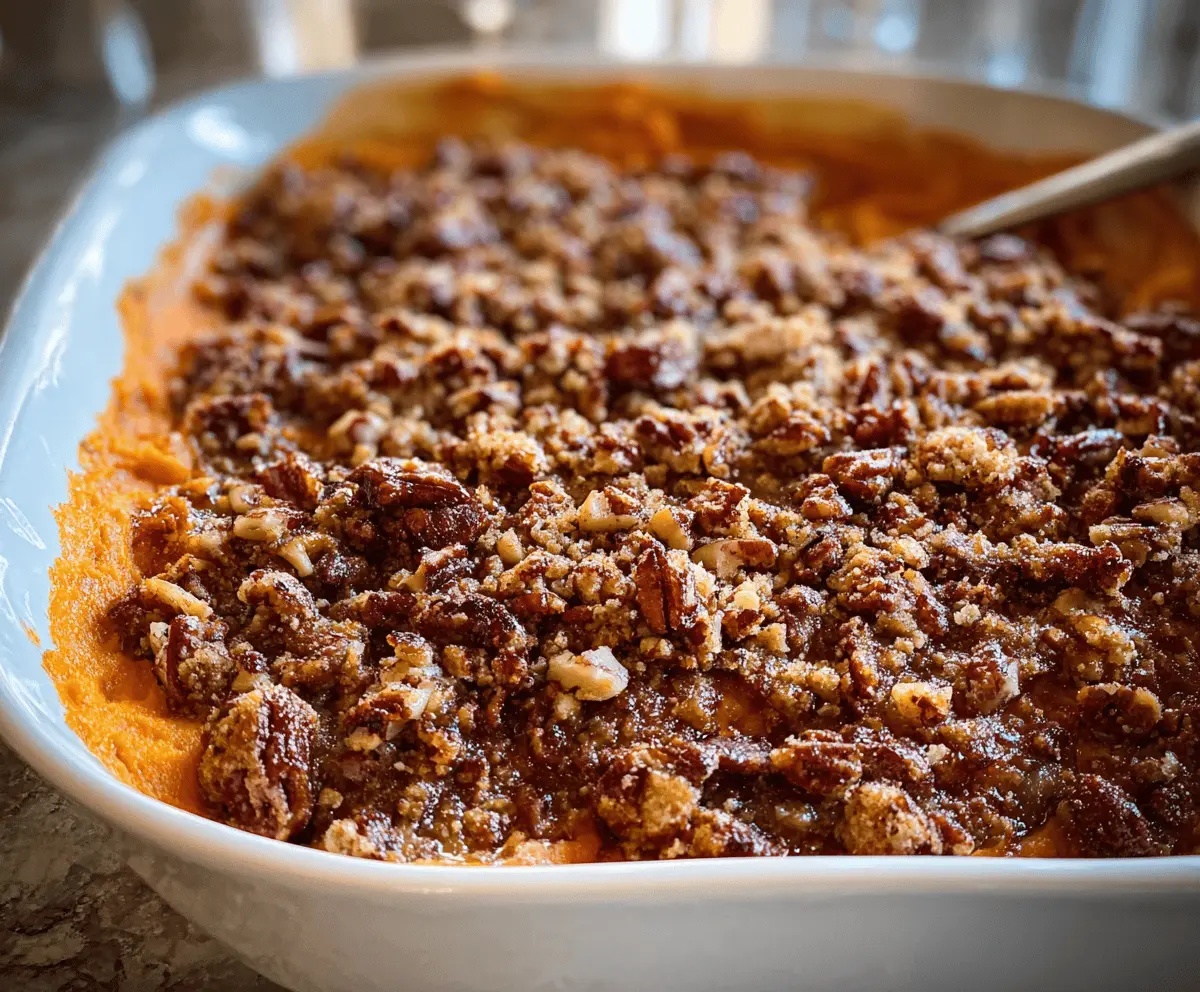 Evenly sprinkle the pecan streusel topping over the sweet potato mixture. This will add a delightful crunch!