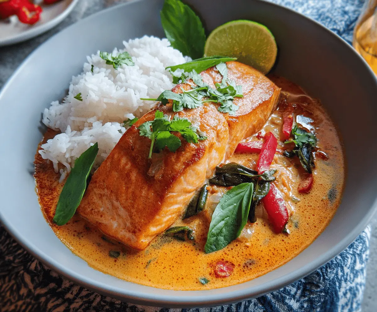 Enjoy your delicious and aromatic Thai Red Curry Salmon, all filled with the perfect balance of spicy, sweet, and creamy flavors!