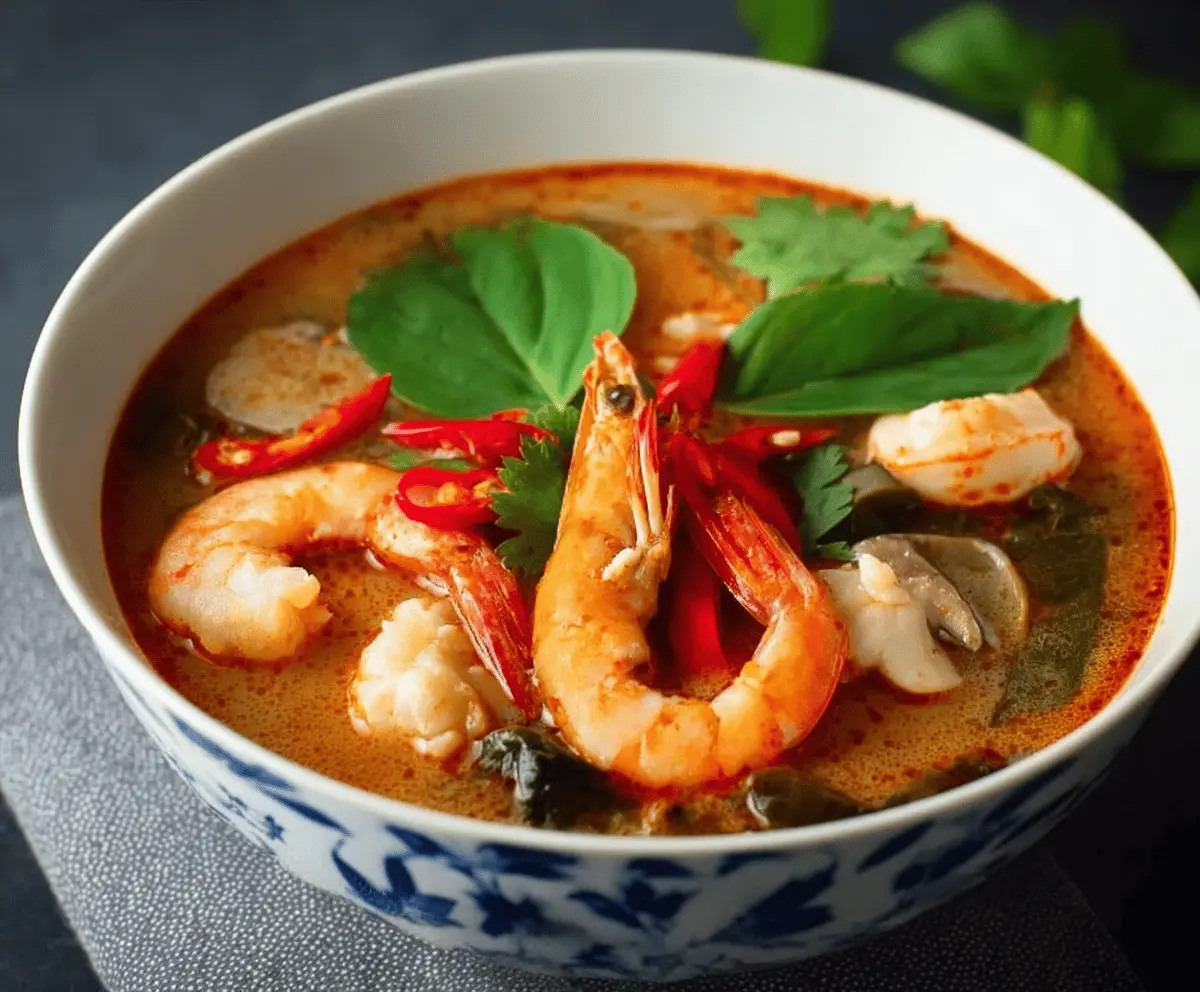 Tom Yum Soup is a spicy and sour Thai classic that brings warm vibes to your table. With shrimp, mushrooms, and fragrant herbs, it’s a flavor explosion!